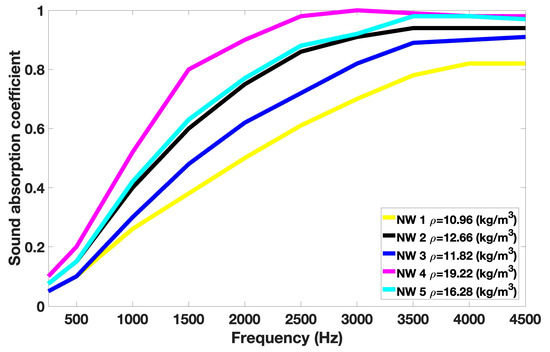 The sound absorption coefficient increases with density, resulting in more interaction between the fibers and energy dissipation. The NW1 sample, which has the lowest density (10.96 kg/m3), presents the lowest sound absorption properties for frequencies ranging from 250 to 4500 Hz. The NW 2 sample, with a density of 12.66 kg/m3, exhibits a better sound absorption coefficient than NW 3 (density of 11.82 kg/m3) because of its higher milkweed content (70% versus 50%). Hasani et al. studied the noise absorption coefficient (NAC) of nonwovens made of Estabragh and hollow PET fibers [32]. They showed that a nonwoven containing more Estabragh led to a higher NAC, which would be due to the larger diameter of Estabragh fibers compared to the hollow PET fibers. Xueting Liu et al. studied the sound absorption coefficient of nonwovens made from kapok and hollow PET fibers at different contents [56]. For a density of 14.45 kg/m3 and a thickness of 20 mm, they found a sound absorption coefficient ranging from 0.20 to 0.25 and 0.65 to 0.82 for frequencies of 500 Hz and 2500 Hz, respectively. These values are similar to those of NW 5, which has approximately the same density (16.28 kg/m3) and thickness (25.4 mm).