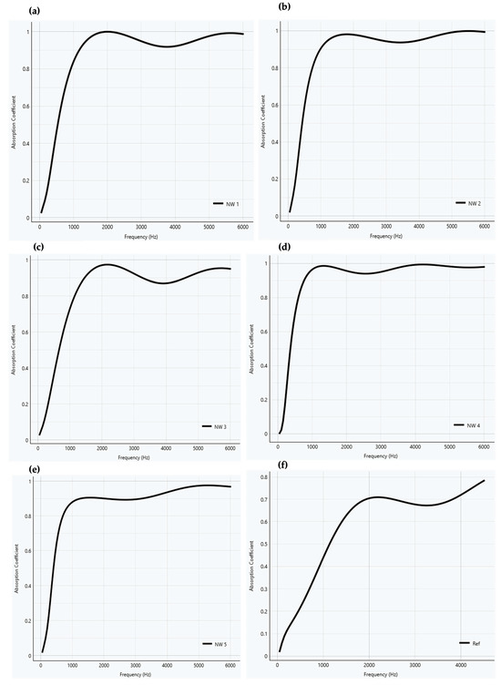Sound absorption coefficient versus frequency for the nonwoven and reference samples for a thickness of 50 mm: (a) NW 1, (b) NW 2, (c) NW 3, (d) NW 4, (e) NW 5, (f) reference.