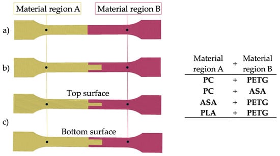 Test 2: (a) PC/PTEG, (b) PC/ASA, (c) ASA/PETG.