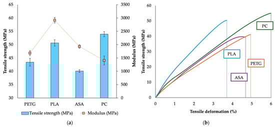The modulus of elasticity was highest for PLA (2915 MPa), indicating higher stiffness. This lower stiffness, typical for amorphous PC in contrast to the semi-crystalline structure of PLA [8], combines with PC’s high tensile strength to yield its notable toughness. These findings are in agreement with other publications, where they emphasize the stiffness of PLA due to its semicrystalline structure [8].