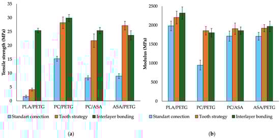 The tensile strength results (Figure 3a) confirm the positive impact of interlayer bonding on the mechanical performance of all the tested material combinations. PC/PTEG achieves the highest tensile strength (29.9 MPa), indicating excellent compatibility between PETG and PC, leading to strong interfacial adhesion. PLA/PTEG and PC/ASA (~25.3 MPa) show comparable values, while ASA/PETG (23.6 MPa) is slightly lower. These results highlight that mechanical properties are not solely dictated by the individual components but are significantly influenced by the quality of the interlayer interface, which is enhanced through interlayer bonding.