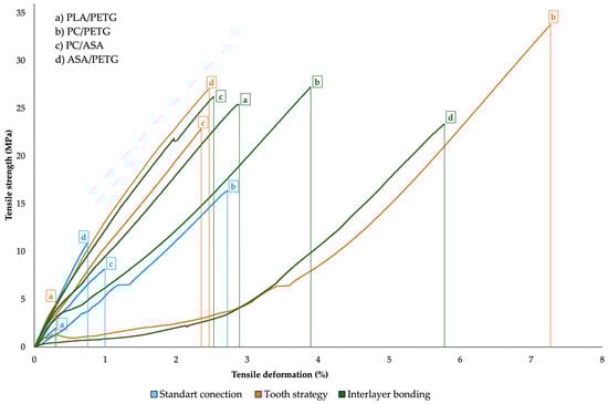 PETG and PLA exhibit substantial differences in mechanical properties, which influence their compatibility in multimaterial 3D printing applications. In Test 2, the material combination demonstrated very low tensile strength (1.6 MPa) and minimal deformation, primarily due to poor adhesion and limited interfacial contact area. The implementation of the “tooth strategy” in Test 3 led to a 2.5-fold increase in tensile strength (4 MPa); however, deformation remained low, indicating persistent interfacial fragility. A notable improvement was observed in Test 4, where interlayer bonding significantly enhanced tensile strength to 25.4 MPa, suggesting the potential applicability of this material combination in stressed environments.