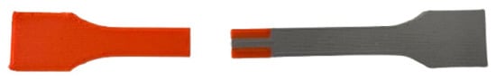 In this study, we analyze the mechanical properties and interfacial connections and explicitly compare our trends with prior reports on multimaterial MEX, which identify interfacial time–temperature history and real contact area as primary drivers of bond strength [12,21]. The selection of material combinations was based on their printability, ensuring that the printed specimens met the required quality standards for mechanical testing.
