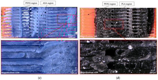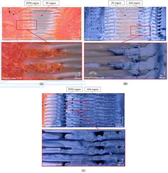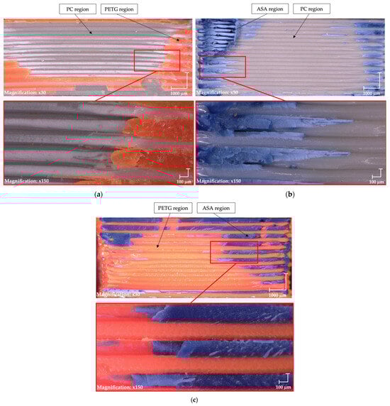 Figure 6 presents a detailed view of the fracture surfaces of the tested specimens. The PC/ASA (Figure 6a) and ASA/PETG (Figure 6b) material combinations exhibit adhesion predominantly at the outer edges of the specimens, which corresponds to their intermediate mechanical performance. In contrast, the ASA/PETG sample (Figure 6c) demonstrates adhesion not only at the edges but also within the central region of the specimen, contributing to its enhanced mechanical properties. This suggests that a more uniform interfacial bonding distribution leads to improved overall mechanical performance. This morphology is attributed to an interface temperature that remained above the glass-transition range of both polymers long enough to permit chain interdiffusion, while deposition pressure enhanced intimate wetting.