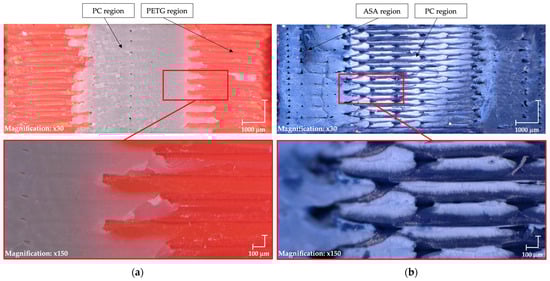 Figure 7a presents the PC/PTEG combination, where the materials exhibit improved bonding attributed to the increased contact area. A similar trend is observed in Figure 7b,c, further indicating that the enhanced surface interaction contributes to better adhesion between the materials.