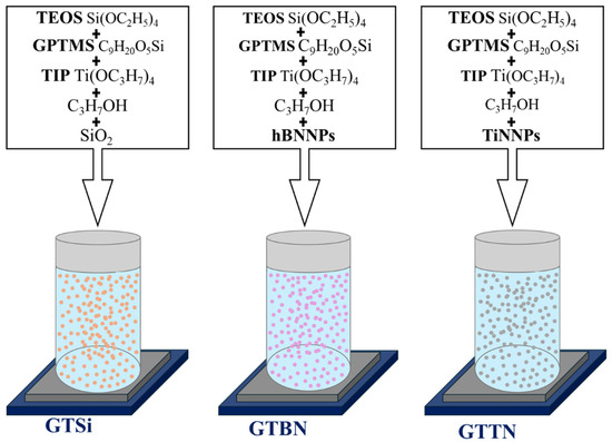 Three hybrid sol solutions were formulated, with their chemical compositions detailed in Figure 1. These solutions were prepared at room temperature by mixing titanium (IV) isopropoxide (TIP, Aldrich (Melbourne, Australia), 97%), tetraethoxysilane (TEOS, Aldrich, 99%), and 3-(glycidyloxypropyl) trimethoxysilane (GPTMS, Aldrich, 98%) using propanol (POCH Basic (Gliwice, Poland), 99.7%) as a solvent. Following 30 min of stirring, 0.2 mL of concentrated hydrochloric acid, serving as a catalyst, was incorporated into 20 mL of the mixture. A suitable amount of colloidal silica (SiO2) suspension was added to the first sol (GTSi) to achieve a molar ratio of GPTMS/TEOS/TIP/SiO2 equaling 0.33/0.6/0.05/0.02. The preparation of the subsequent solutions, GTBN (1) and GTTN (2), followed the same methodology, but utilized boron nitride (1) and titanium nitride (2) nanoparticles (sourced from Sigma-Aldrich, Saint Louis, MO, USA) instead of the SiO2 suspension. The average hydrodynamic diameter of the TiN nanoparticles was approximately 178 nm, while for the hBN nanoparticles it was around 230 nm (DLS measurement—Supplement File Figure S1). Prior to their addition, the nitride nanoparticles were ultrasonically dispersed in propanol for 45 min, then incorporated into the solutions before the catalyst (HCl) was introduced. The component quantities were selected to maintain a ceramic particle concentration of 1.25% molar. This concentration was chosen to ensure that the nanoparticle suspension remained stable and homogeneous for at least 48 h. The resulting solutions were aged for 24 h and stored in a sealed glass container.