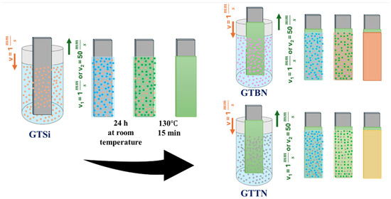 Double-layer sol–gel systems were the combination of GTTSi and GTBN/GTTN sols deposited via dip coating with a fully automated dip coater at two different withdrawal speeds, v1 = 1 mm/s and v2 = 50 mm/s. The schematic coating deposition and curing are presented in Figure 2. The first layer was dried under ambient conditions for 24 h, then stabilized through a two-step thermal treatment at 80 °C for 10 min and 130 °C for 15 min. The same procedure was followed after the second layer was applied.