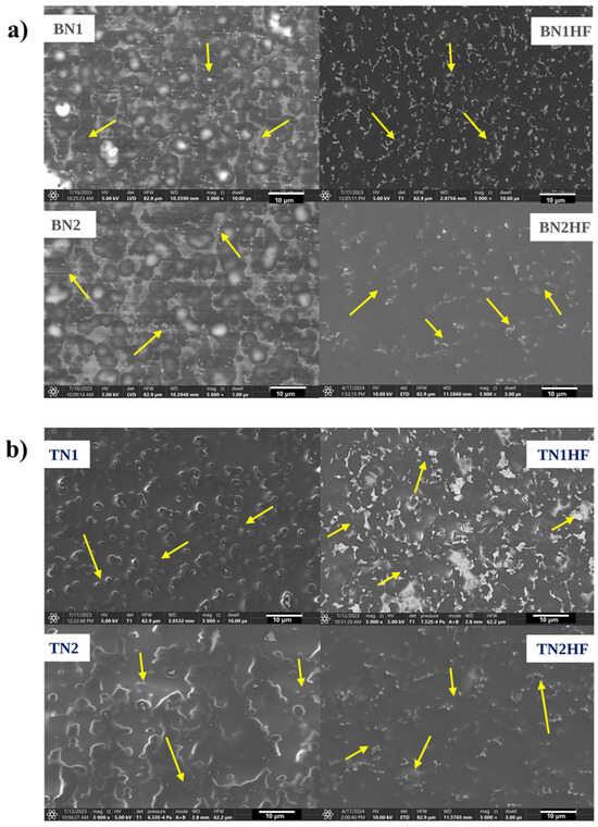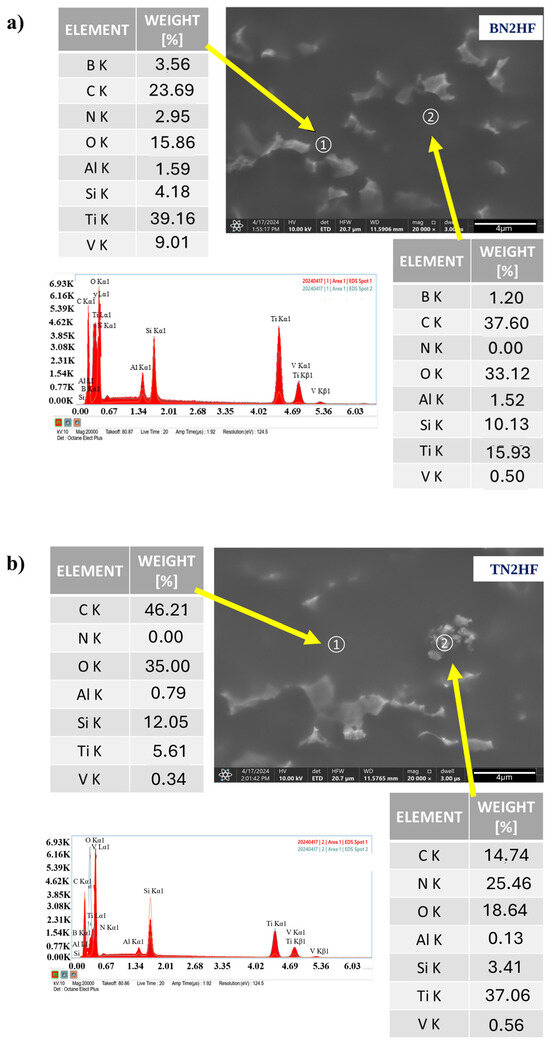Figure 3 shows SEM images of the silica coatings deposited on the Ti6Al4V alloy substrate with the incorporated TiN and hBN particles. The surface observations confirmed the presence of the ceramic particles on the modified titanium alloy surface (marked with yellow arrows in the images). The nanoparticles’ distribution is presented in the Supplement File (Figure S1). However, the results also indicated the layers were not completely homogeneous, as nitride particles with an uneven distribution were revealed. Neither pores nor obvious cracks were observed in the layer. The presence of nitride nanoparticles was further confirmed through the EDS chemical analysis conducted for the BN2HF and TN2HF samples. The layers appeared continuous at the 10,000× magnification, although on the surface there were clearly visible agglomerates (Figure 4). The chemical analysis at point 1 displayed the BN particles of about 0.3 µm, while at point 2 the analysis confirmed the presence of an organic–inorganic matrix (Figure 4a). In the case of layers with TiN nanoparticles measuring 0.5 µm (Figure 4b), point 1 enabled the layer identification and point 2 confirmed the particles’ presence. However, the chemical composition given in the tables is indicative and does not represent an analysis of a precise amount.