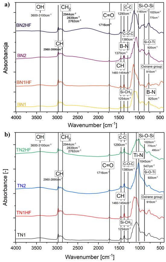 Figure 5 shows the FTIR spectra of the samples immediately after the layer application in the 400–4000 cm−1 region. In all the spectra, the weak band observed in the spectral range 3100–3600 cm−1 was attributed to the physically and/or chemically bound water, specifically representing the symmetric OH stretching of asymmetrically hydrogen-bonded water molecules. Additionally, the CH alkyl stretching bands were detected in the 2890–2960 cm−1 region [45,46]. The C-H bending vibrations were associated with a band observed in the 1454–1460 cm−1 region, while those at 1380 and 1290 cm−1 were attributed to the skeletal vibrations of C-O-C derived from GPTMS [47]. The bands at 770, 1020, and 1160 cm−1 related to the stretching vibration of Si-O-Si bonds [48,49]. The appearance of these bands verified the polycondensation reaction between TEOS and GPTMS in the coating [25]. A weak band at 910 cm−1 showed the presence of the epoxy ring from GPTMS [50]. Moreover, a weak band at 955 cm−1 was attributed to Ti-O-Si vibration [51]. A weak and broad band at 795 cm−1 corresponded to the Si-C bonds of the CH3SiO3 groups on the surfaces of silica particles. This peak resulted from the condensation between Si-OH and GPTMS, which accounted for the increased hydrophobicity of the coating [48,52]. The FTIR spectrum of the coatings with hBN particles (Figure 5a) demonstrated characteristic bands at 825 cm−1 and 1370 cm−1 attributable to the B-N bond vibrations. Specifically, the strong and wide band at 1370 cm−1 corresponded to the in-plane B-N stretching vibration, while the narrower band at 825 cm−1 was linked to the out-of-plane bending vibration of B-N-B [53,54,55]. In Figure 5b, the band at 1045 cm−1 could be attributed to Ti-N stretching vibrations, while vibrations at 547 cm−1 could be assigned to Ti-N stretching modes [56,57].