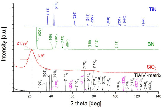 Prior to the X-ray phase analysis, the starting substance powders were characterized in terms of their phase composition. The measured diffractograms in classical Bragg–Brentano geometry are presented in Figure 6. The metallic substrate consisted of two phases—the polymorphic β-TiAlV variant (hcp structure—with the P63/mmc space group) with a predominant volume fraction and α-TiAlV (bcc structure—with the Im3m space group). The measured diffractogram for the matrix is presented as a black line in Figure 6. A common component used in the BN and TiN deposits was SiO2 used as a water suspension (Figure 5—red line). The measured diffractogram revealed only one line with a half-width of approximately 6.8 degrees. The peak broadening proved the SiO2 phase to be an amorphous state. The position of this peak—21.99° (2theta) corresponded to an interplanar distance of 4.038 Å. This distance is characteristic of the strongest diffraction line of SiO2 in the polymorphic form of cristobalite (ICDD PDF-4 card no 00-039-1425). The other two components, boron nitride and titanium nitride, were crystalline. The measured diffractograms are marked in Figure 6 as green and blue lines for the BN (ICDD PDF-4 card no. 01-073-2095) and TiN (ICDD PDF-4 card no. 00-038-1420), respectively.