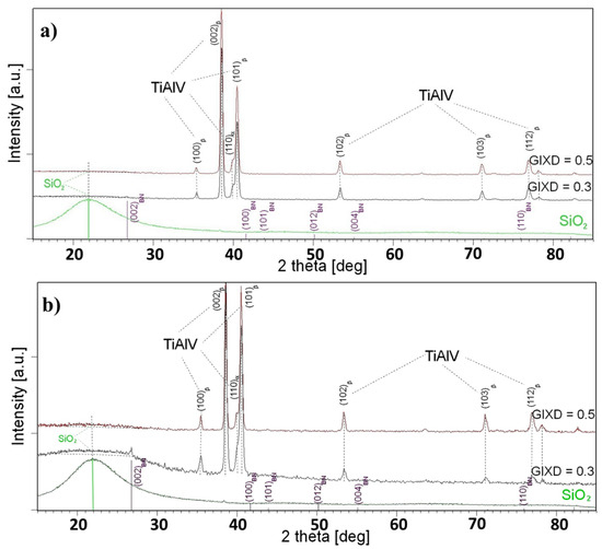 Figure 6 shows the diffractograms measured at constant angles of 0.3° and 0.5° for the boron nitride layers that were deposited on the non-etched TiAlV substrate with withdrawal speeds of 1 and 50 mm/s—Figure 7a and Figure 7b, respectively. For comparison, they were contrasted with the diffractogram measured for SiO2 (green line) and the theoretical positions of the diffraction lines of the boron nitride standard (blue bars). Regardless of the deposit type applied to the TiAV matrix, the layers produced at a speed of 1 mm/s resulted in the diffractograms showing only lines representing the crystalline phases characteristic for the substrate: β-TiAlV and α-TiAlV. Moreover, a low-intensity peak was found in the 2theta position, characteristic of the amorphous SiO2 phase. This fact proved that the layer was composed only of SiO2, while the areas containing boron nitride (BN1) did not exceed the X-ray detection limit. Hence, no lines characteristic of this phase were observed in the diffraction patterns. A similar situation occurred in the case of the TiN1 sample for the layer of titanium nitride (Figure 8a).