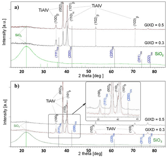 GIXD patterns measured for TiN1 (a) and TiN2 (b) coatings deposited on non-etched TiAlV matrix.