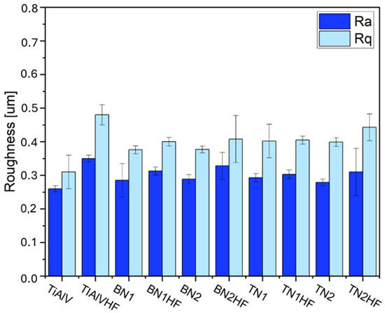 The measurements revealed that the TiAlV alloy modified with the sol–gel layers was noticeably enhanced. The increase in the Ra and Rq parameters was observed for all the tested layers in comparison to the base alloy (Figure 9). It is evident that etching the Ti6Al4V alloy prior to the deposition process increased the surface microroughness, as was proven by the Ra and Rq elevation [58,59]. The Ra parameter rose by 0.10 µm on average, and the Rq parameter by 0.18 µm. Etching not only eliminated adverse surface impurities but also changed the surface topography [58,60,61,62]. Introducing ceramic particles into the layers reduced roughness parameters in comparison to the etched alloy (TiAlVHF sample). The reduced roughness of the layers containing TiN and BN nanoparticles resulted from the particle size within the layer and the particles’ uneven distribution, which correlated with the SEM observations.