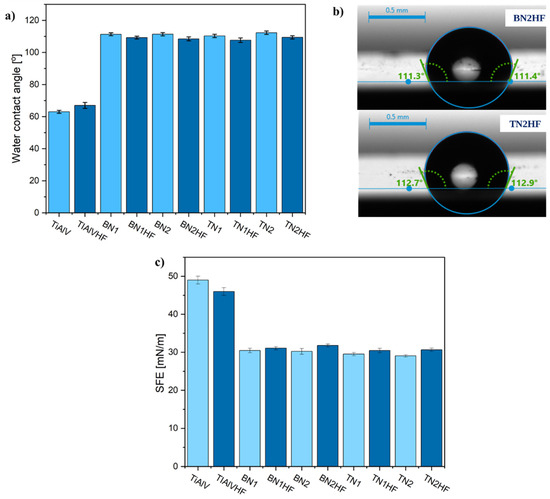 The modification of TiAlV alloys with organic–inorganic layers had a pronounced effect on their surface characteristics, as evidenced by the measurements of the contact angle (Figure 10a) and surface free energy (Figure 10c). The application of hybrid coatings significantly increased the contact angle while reducing the surface free energy, with both parameters strongly influenced by the ceramic particle content. For the BN2HF layers, the contact angle increased by an average of 50°, accompanied by a 19.6 mN/m decrease in surface energy. Similarly, the TN2HF layers exhibited an average contact angle increase of 49°, with an 18.9 mN/m reduction in energy. These results indicate a clear shift from hydrophilic to hydrophobic surface behavior (Figure 10b). The better hydrophobicity of the enriched coatings may be attributed to the elevated surface roughness, consistent with the Wenzel and Cassie–Baxter models, which relate roughness to wettability [29,63,64].