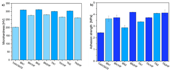 Figure 11a illustrates the microhardness changes of the measured samples. The plot analysis revealed that the addition of ceramic particles significantly increased microhardness in comparison to the base layer (TiAlV/SiO2). The hardest samples were the ones whose surfaces had not been etched. Regrettably, none of the developed layers attained the microhardness level of the starting alloy, i.e., exceeding 360 HV [65]. In further studies, the adhesion of the layers to the titanium substrate was examined by measuring the pull-off strengths. The results are summarized in Figure 11b. The average pull-off strength was 2.4 MPa for the TiAlV/SiO2 reference. In general, the proposed layers adhered more effectively to the etched metallic substrate, which stayed in accordance with the literature [66,67]. After the incorporation of the hBNNPs or TiNNPs, the BN2HF specimen revealed that the pull-off strength increased by 71% (to 4.1 MPa) and the highest value was obtained for TN2HF (4.2 MPa). However, the resulting films’ adhesion was marginally lower compared to the other sol–gel coatings; this difference may be attributed to the ceramic nanoparticle size utilized in the preparation [68,69]. Still, it is worth noting that the interface adhesion measured via this method is limited by the adhesive strength, which is usually lower than 80 MPa [68].