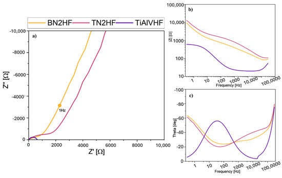 Electrochemical Impedance Spectroscopy (EIS) results for TN2HF, BN2HF, and TiAlVHF coatings in 0.9% NaCl solution at 37 °C: (a) Nyquist plots; (b) Bode plots showing the impedance modulus |Z| vs. frequency; (c) Bode plots showing the phase angle vs. frequency.