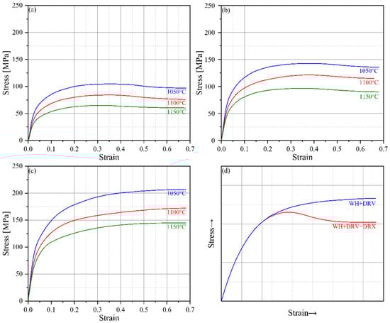 The measured rheological behavior data (stress–strain curves) are shown in Figure 2. The flow stress of the stainless steel decreased with increasing deformation temperature and decreasing strain rate and increased conversely. This behavior was related to the effects of deformation temperature and strain rate on the work hardening (WH), dynamic recovery (DRV), and dynamic recrystallization (DRX) of the metal [17]. Higher deformation temperatures and lower strain rates can easily induce DRV and DRX in metals. The softening effect of DRV and DRX can effectively offset the influence of WH and enhance the softening ability of metals. Once the softening effect of DRV and DRX exceeds the hardening effect of WH, the flow stress will no longer increase but begin to decrease and reach a peak value. When the softening effect of DRV and DRX is balanced with the hardening effect of WH, the flow stress will be in a steady state (Figure 2a,b). Therefore, the high-temperature plastic deformation mechanism of the metal in this case mainly includes WH, DRV, and DRX, as shown in Figure 2d. However, the lower deformation temperature and higher strain rate mainly induce DRV in metal. The softening effect caused by DRV is not enough to completely offset the hardening effect of WH, resulting in the continuous increase in flow stress at a decreasing rate with increasing strain (Figure 2c). Therefore, in this case, the high-temperature plastic deformation mechanism of the metal mainly includes WH and DRV, as shown in Figure 2d. In general, AISI-410 martensitic stainless steel has three plastic deformation mechanisms of WH, DRV, and DRX at low strain rates (0.1 s−1 and 1 s−1) within the forging temperature range, and the plastic deformation mechanisms of WH and DRV mainly occur at high strain rates (10 s−1).