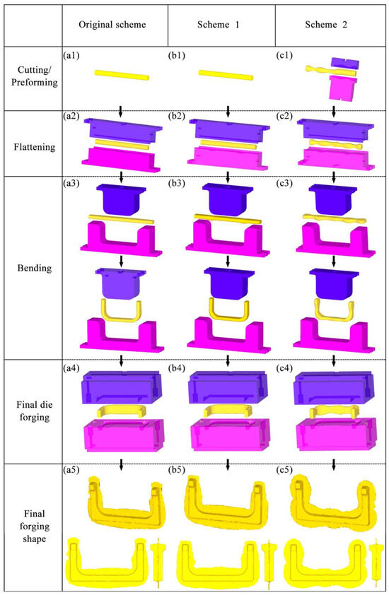 Forging schemes and final forged shapes of the U-shaped forgings: (a1–a5) Original Scheme; (b1–b5) Scheme 1; (c1–c5) Scheme 2.