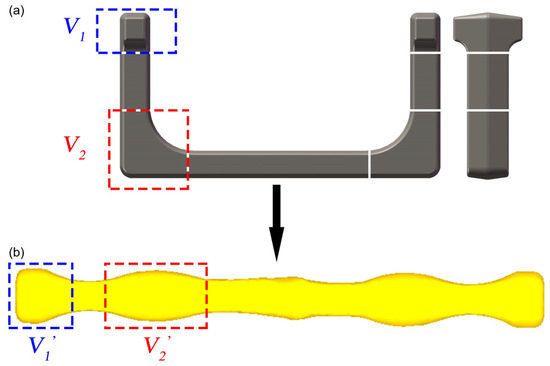 Based on the analysis of the Original Scheme and Scheme 1, Scheme 2 (Preformed Volume Allocation Scheme) is proposed to optimize billet volume pre-allocation through a dedicated preforming step. This scheme incorporates strategic volume pre-allocation at the ends and corners, as shown in Figure 4(c1–c5) and detailed in Figure 6. This scheme introduces a multi-directional forging operation before the flattening step of Scheme 1 to strategically form protruding features with intentionally allocated excess volumes (V1′ at ends and V2′ at corners) at critical billet locations. These preformed volumes (Figure 6b) are designed to precisely match the geometric requirements of high-fill-demand regions in the target U-shaped forging (Figure 6a), accounting for both the final forged geometry (V1, V2) and the necessary flash compensation volume. The temperature of the billet may drop due to its heat loss during this preforming process. Therefore, if necessary, the billet needs to be heated again to ensure that it has a suitable temperature in the subsequent forging process. Mesh sensitivity analysis was conducted to ensure the result stability. Three mesh densities (40,000, 60,000, and 80,000 elements) were tested for the final die forging step. The critical outputs (equivalent strain, stress, damage, and wear depth) varied by less than 5% between 60,000 and 80,000 elements (Table 4), confirming that the 60,000-element mesh provided sufficient accuracy while balancing computational efficiency. In this scheme, the added preforming step makes the volume allocation of the billet closer to that of the target forging, thereby reducing the risk of incomplete die filling and addressing problems such as excessively small flash. In addition, this scheme is expected to reduce the lateral flow of the billet in the final forging, reduce the risk of the damage-induced cracking in the forging, and reduce the wear of the final forging die.