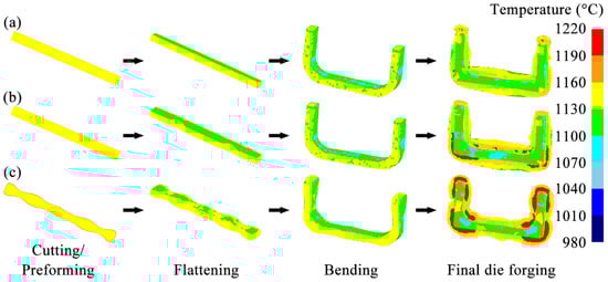 Temperature distributions of the billets during multi-step forging: (a) Original Scheme; (b) Scheme 1; (c) Scheme 2.