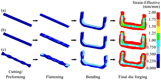 Equivalent strain distributions of billets during multi-step forging: (a) Original Scheme; (b) Scheme 1; (c) Scheme 2.