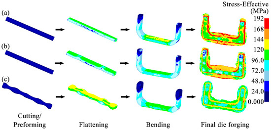 The billet is subjected to complex multi-directional stresses during the forging process. Equivalent stress can reflect the comprehensive effect of complex stresses on the billet. Therefore, equivalent stress was an important basis for analyzing the stress conditions of the billet and problems related to the forging process [37].