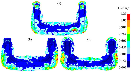 Damage is used to assess the cracking tendency of the billet during forging. A larger damage value means a higher risk of cracking. Forgings formed by the multi-step forging often undergo complex plastic deformation, and their damage will gradually accumulate [38]. Therefore, this work was focused on the damage accumulation of U-shaped forgings after final die forging.