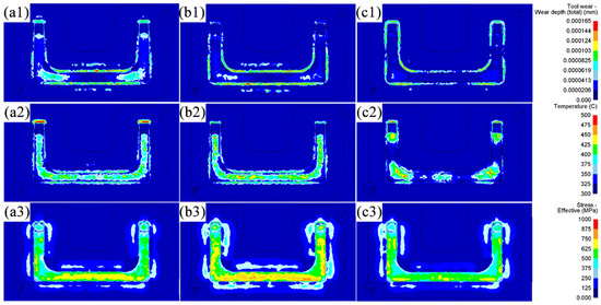 Comparison of wear, temperature, and stress of the final lower forging die in U-shaped forgings: (a1–a3) Original Scheme; (b1–b3) Scheme 1; (c1–c3) Scheme 2.