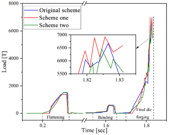 Forming load and impact energy are important indicators for evaluating the economy of the forging process and the service life of the forging die [40,41,42]. This section presents a combination of the analyzed results of the temperature, strain, stress, and damage of the abovementioned billet with the forging die wear to explore the differences in forming load and impact energy among the three schemes. Accordingly, the mechanism of optimizing the forging scheme to reduce energy consumption and extend the die life was revealed.