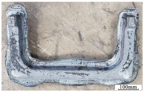 To verify the effect of FEA, the production trials of U-shaped forgings were carried out using Scheme 2. First, the AISI-410 martensitic stainless steel bar was heated to the initial forging temperature of 1150 °C to form a pre-designed billet with protruding features. Subsequently, to compensate for the heat loss of the billet during the preforming process, it was reheated to 1150 °C before subsequent flattening. Finally, the billet that was heated second was subjected to the steps of flattening, bending, and final die forging using a 6300-ton screw press (Figure 13). Figure 14 shows the U-shaped final forging of Scheme 2. The main body morphology and flash distribution of the final forging were highly consistent with the FEA results in Section 3. Production trials evaluated forging quality through visual inspection for geometric completeness (full die filling), uniform flash distribution, and absence of defects (cracking/folding), showing that Scheme 2 significantly improved the forming quality. The trials involved 305 forgings per scheme, as statistically detailed in Table 5. Although the preforming step adds one heating cycle and ~15% processing time per piece, the 50% longer die life and 24.3% higher yield (Table 5) substantially offset this cost in mass production. The close agreement between predicted damage/wear (FEA) and actual defect-free forgings (trials) further validates the robustness of the Oyane/Archard models to parameter uncertainties. Similarly to the multi-stage bending process for large-scale coupler yokes proposed by Je et al. [9], the volume pre-allocation strategy (Scheme 2) addresses incomplete die filling and cracking by optimizing geometric compatibility between the billet and die cavity. However, while Je et al. [9] utilized rollers and slanting dies to reduce friction and strain concentration, our approach strategically pre-allocates material volume at ends/corners via preforming, achieving a higher forging qualification rate (96% vs. unreported in [9]) and extending die service life by 50% per refurbishment cycle. Furthermore, energy parameter sensitivity was confirmed by production trials: actual energy consumption (765 ± 42 kJ) matched the FEA predictions within 5.5% error.