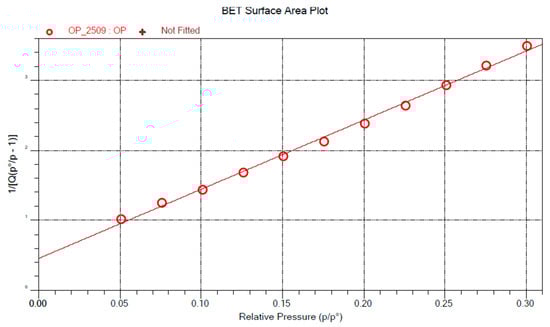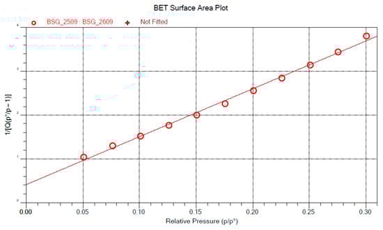 The linear form of this equation (Equation (1), right-hand side) allows for the determination of the parameters from which the specific surface area of the sample is calculated according to Equation (2)