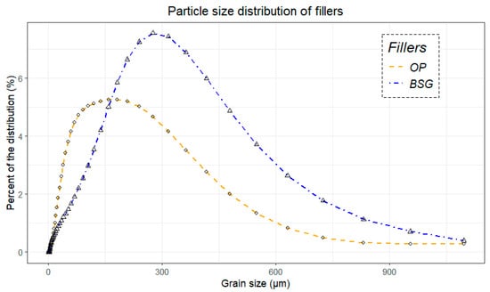 The particle size distribution (0.01 µm to 10,000 µm) of the by-product particles used as fillers was estimated using a laser granulometer equipped with a solid matrix detection module (Mastersizer—Sirocco 2000; United Kingdom, Malvern Panalytical Ltd., Malvern, Worcestershire, UK). Three parameters were identified to characterize the particle size distribution of the samples and allow for comparisons. The d10 parameter represents the particle diameter below which 10% of the particles fall. Similarly, d50 represents the median particle size, and d90 corresponds to the particle diameter at which 90% of the cumulative distribution is reached.