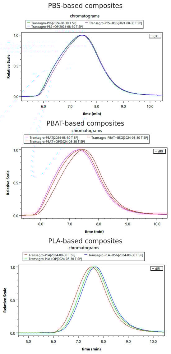 The number-average molecular weight (Mn) (PMMA equivalent), mass-average molecular mass (Mw) (PMMA equivalent), and polydispersity index (PDI = Mw/Mn) of the materials were determined using size-exclusion chromatography (SEC). Prior to analysis, the samples were solubilized overnight at room temperature in hexafluoroisopropanol (HFIP) until the complete dissolution of the polymers. Biocomposite fragments were subsequently filtered (0.2 µm) to remove undissolved organic filler particles.