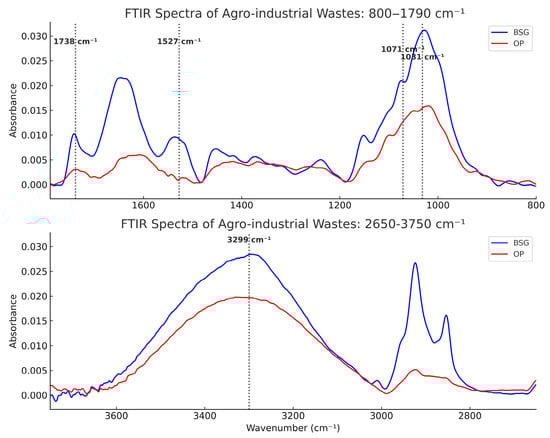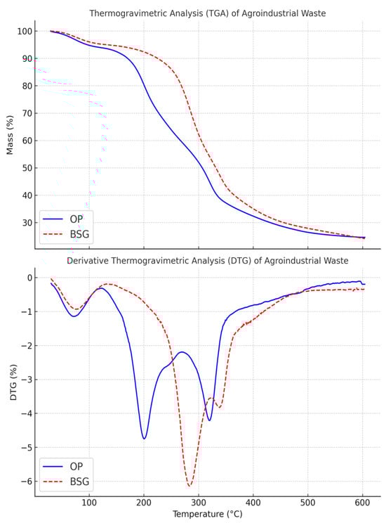 Beer production, a major agro-industrial sector, generates an annual output ranging from 1.91 to 1.97 billion hectoliters []. A key by-product of brewing is brewers’ spent grain (BSG), which accounts for approximately 85% of solid residues generated []. BSG primarily consists of the insoluble grain fraction, including husks, pericarps, and hulls, mainly from barley but sometimes also from wheat, maize, or rice []. The brewing process generates approximately 20 kg of wet BSG per 100 L of beer produced, leading to an estimated annual global production of 38.6 million tons []. Chemically, BSG is composed of fibers (50% dry weight, including cellulose and hemicellulose), proteins (up to 30%), and lignin (10–30%) []. BSG is a promising functional filler for biodegradable packaging biocomposites, due to its low economic valorization, favorable chemical composition, and capacity to enhance stiffness and thermal stability through thermally induced transformations.