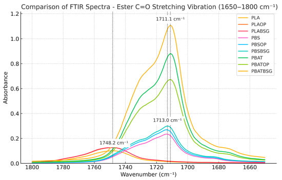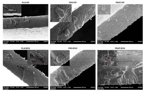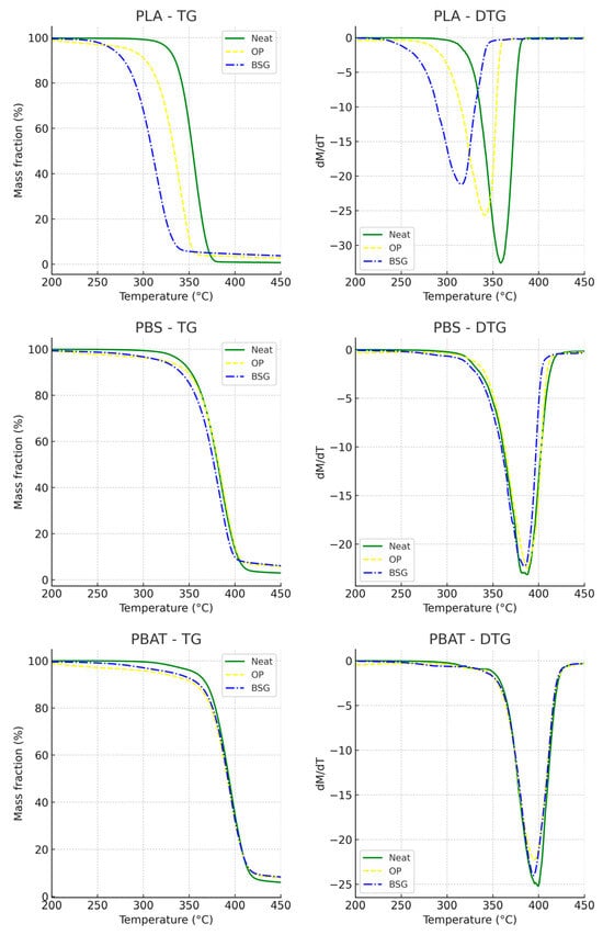 Thus, this study investigates the intrinsic effect of raw filler type as a function of the polyester matrix, independently of any chemical compatibilization. A full factorial design enables a systematic assessment of the interactions between three biopolymer matrices (PLA, PBS, and PBAT) and two agro-industrial fillers (OP and BSG), establishing a solid baseline for the future development of compatibilized systems [].