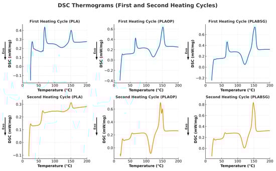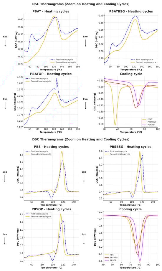 For PBS and PBAT, the applied program consisted of an initial heating cycle from ambient temperature up to 200 °C, followed by a 3 min isothermal phase at 200 °C, then cooling down to −65 °C to eliminate thermal history effects. A second heating cycle was then performed from −65 °C to 200 °C. For PLA, the maximum temperature reached in the first cycle was 180 °C, followed by cooling to 0 °C and a subsequent reheating to 180 °C. For the first and second cycles, the heating and cooling rates were set at 10 °C/min. The carrier gas used was argon, with a flow rate of 40 mL/min.