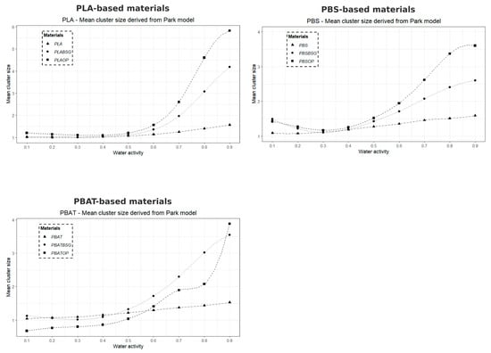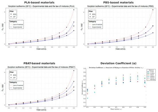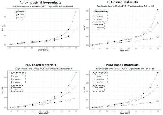 The water sorption isotherms at 28 °C obtained by Dynamic Vapor Sorption (DVS) were modeled using the multimodal sorption model developed by Park [], which is widely recognized and frequently applied to describe the water vapor sorption behavior of bio-based polyesters and cellulose-based compounds. Unlike other models such as GAB, the Park model simultaneously accounts for Henry, Langmuir, and clustering sorption modes, making it well suited to the sigmoidal isotherms and multi-mechanistic water uptake observed in our semi-crystalline polyesters and biocomposites.