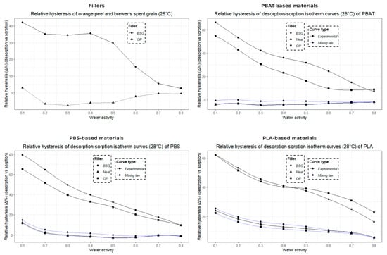 The water vapor sorption capacity of the samples was measured at 28 °C using a microbalance under controlled humidity (SPSx-1µ High Load, ProUmid GmbH & Co. KG, Ulm, Germany). The samples were pre-dried at 40 °C in an oven for 24 h before being placed (~200 mg) into the measurement system. The relative humidity (RH) was initially set to 0% until the sample weight stabilized (dm/dt = 0.01%) with a stabilization time of 15 min.