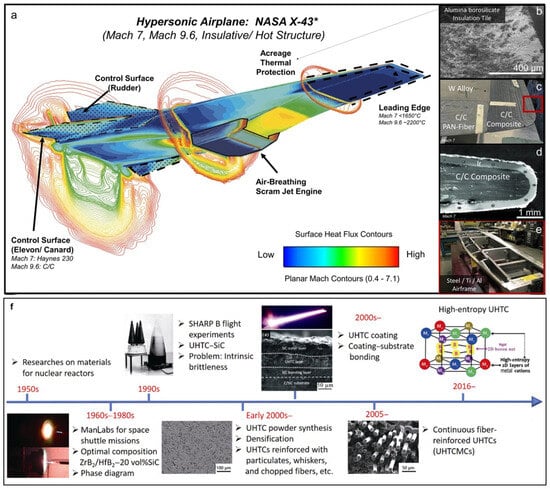 Computational fluid dynamics (CFDs) simulation, structural components, and the associated materials used for the X−43 hypersonic vehicle as well as historical perspective on research related to ultrahigh-temperature ceramics and composites: (a) CFD simulation results at a Mach 7 test condition with the engine operating; (b) aluminoborosilicate insulation tile with an emissive coating used for acreage protection thermal protection; (c) nose and leading−edge design integrating C/C composites and refractory tungsten alloy SD 180; (d) sharp leading edge cross-section showing the C/C composite with a refractory Ir coating; (e) airframe of the vehicle composed of steel/aluminum skin and Al/Ti bulkheads; and (f) historical perspective from 1950s to present. Copied with permission from Springer Nature [2,5].