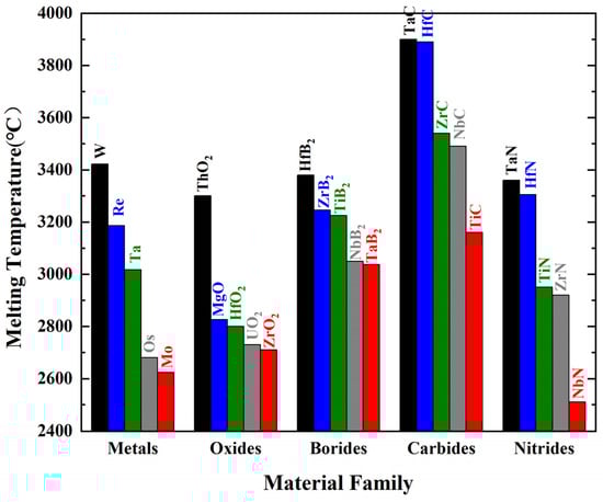 A comparison of the melting temperatures of the most refractory members of several classes of materials. Copied with permission from John Wiley and Sons [7]. The borides, carbides, and nitrides with the melting points higher than 3000 °C are considered as ultrahigh-temperature ceramics.