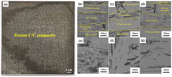 Photograph of a typical C/C composite (a) and SEM images of the cross-sections of C/C composites with different densities (b,e): 1.0 g/cm3; (c,f): 1.2 g/cm3; and (d,g): 1.4 g/cm3. Copied with permission from Elsevier [14].
