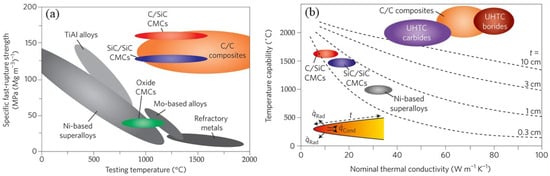 Comparison of high temperature properties of C/C composites and other materials. (a) Specific fast-rupture strength as a function of the temperature of various metals and composites. (b) An Ashby-type map of temperature capability and nominal thermal conductivity of different materials, including Ni-based superalloys, CMCs, UHTCs, and C/C composites. Copied with permission from Springer Nature [18].