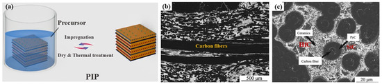 (a) Schematic diagram of PIP and (b,c) microstructure of C/C-SiC-HfC composites prepared via PIP. Copied with permission from American Chemical Society and Springer Nature [26,32].