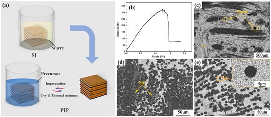 (a) Schematic diagram of SI combined with PIP, as well as (b) bending stress-strain curve and microstructure (c–e) of the C/C-HfB2-SiC composites prepared via SI + PIP process (inset in (e) is the enlarged image showing the cross section of one carbon fiber within the ceramic matrix). Copied with permission from American Chemical Society and Elsevier [26,44].