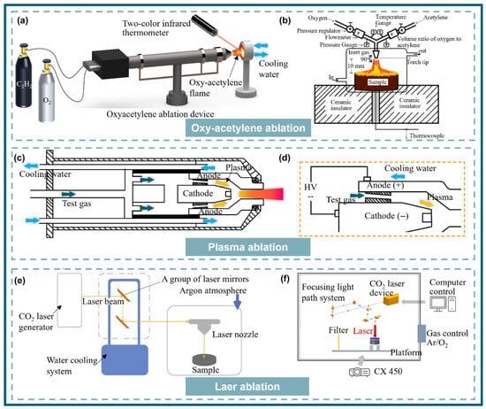 Schematic diagram of ablation testing systems and typical flame generation layout: (a,b) oxyacetylene ablation, (c,d) plasma ablation, and (e,f) laser ablation. Copied with permission from Elsevier [48].