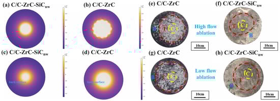 After ablation, the surface is typically divided into three regions: central, transition, and edge. Ablation products and mechanisms differ across these regions [11,67]. The central region experiences direct impingement by the flame jet, with the highest thermal shock pressure and surface temperature, leading to the most severe oxidation ablation. For composites with poor ablation properties, oxides may flake off, forming deep ablation pits. The transition zone surrounds the central region, experiencing lower temperatures and thermal shock forces but significant shear stress from rebound expansion of the high-speed flame. Primary ablation products are various sintered oxides. The edge region is outermost, experiencing lower temperatures and pressures but potentially higher oxygen partial pressure, often forming a dense molten oxide film. Figure 10 shows the temperature simulation and surface morphology of the C/C composites modified with ZrC and SiC nanowires (SiCnw) during oxygen–acetylene ablation and after ablation, respectively [68]. As shown in Figure 10a,b, the temperature distribution of the ablation surface is clearly divided into three zones through simulation, with the sizes of these regions mainly related to the thermal conductivity of materials. The results show that the ablation temperature of the C/C-ZrC is higher than that of the C/C-ZrC-SiCnw under the same oxygen acetylene ablation, which is due to the high thermal conductivity of SiCnw. In Figure 10e–h, it can be seen that these composites form a relatively dense oxide layer after ablation, with distinct three regions. Further research indicates that the ablation products in the central region are ZrO2 layers, the transition region is a molten and dense SiO2 layer, and the edge region is a coexistence zone of SiO2 spherical particles and SiC nanowires.