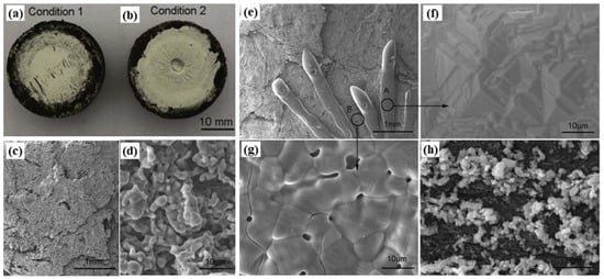 Photographs and SEM images of the C/C-ZrC composites after ablation under different conditions: (a,b) surface appearance of the ablated C/C-ZrC composites; surface morphology of C/C-ZrC composites after ablation under condition 1: (c) low magnification and (d) high magnification; surface morphology of C/C-ZrC composites after ablation under condition 2: (e) low magnification (f,g) high magnification and (h) undersurface oxidation composites. Copied with permission from Elsevier [70].