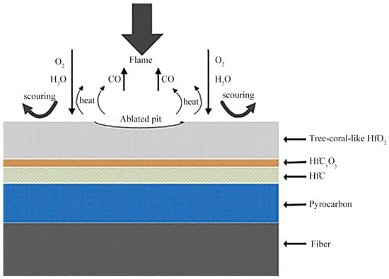 Schematic diagram of the layered structure of C/C-HfC composites after ablation. Copied with permission from Elsevier [73].