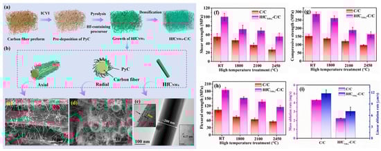 (a,b) Schematic diagram of the process of HfCNWs-C/C; (c,d) SEM images of the as-prepared HfCNWs in carbon fiber preforms; (e) TEM images of the HfCNWs; (f–h) mechanical properties of the composites before and after heating at 1800 °C, 2100 °C, and 2450 °C, respectively: (f) interlaminar shearing strength (ISS); (g) out of plane compression strength (OCS); and (h) the flexural strength (FS); and (i) ablation performance of the C/C and HfCNWs-C/C composites. Copied with permission from Elsevier [99].