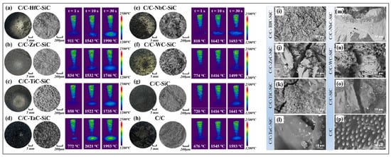 (a–h) Macroscopic and infrared imaging of the C/C-MeC-SiC composites during ablation as well as (i–p) SEM images of the surface morphology of the C/C-MeC-SiC composites after ablation for 30 s under the plasma torch with the heat flux density of 7.26 MW/m2, with (a,i) C/C-HfC-SiC, (b,j) C/C-ZrC-SiC, (c,k) C/C-TiC-SiC, (d,l) C/C-TaC-SiC, (e,m) C/C-NbC-SiC, (f,n) C/C-WC-SiC, (g,o) C/C-SiC, and (h,p) C/C. Copied with permission from Elsevier [60].